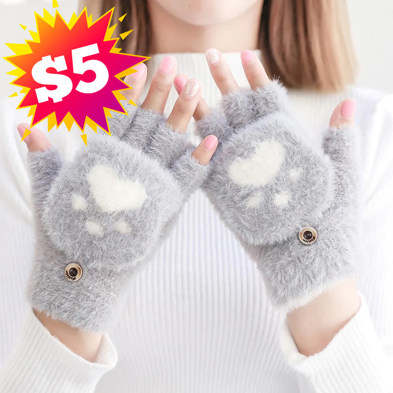 Women's Warm Cat Paw Print Mittens Fluffy Gloves