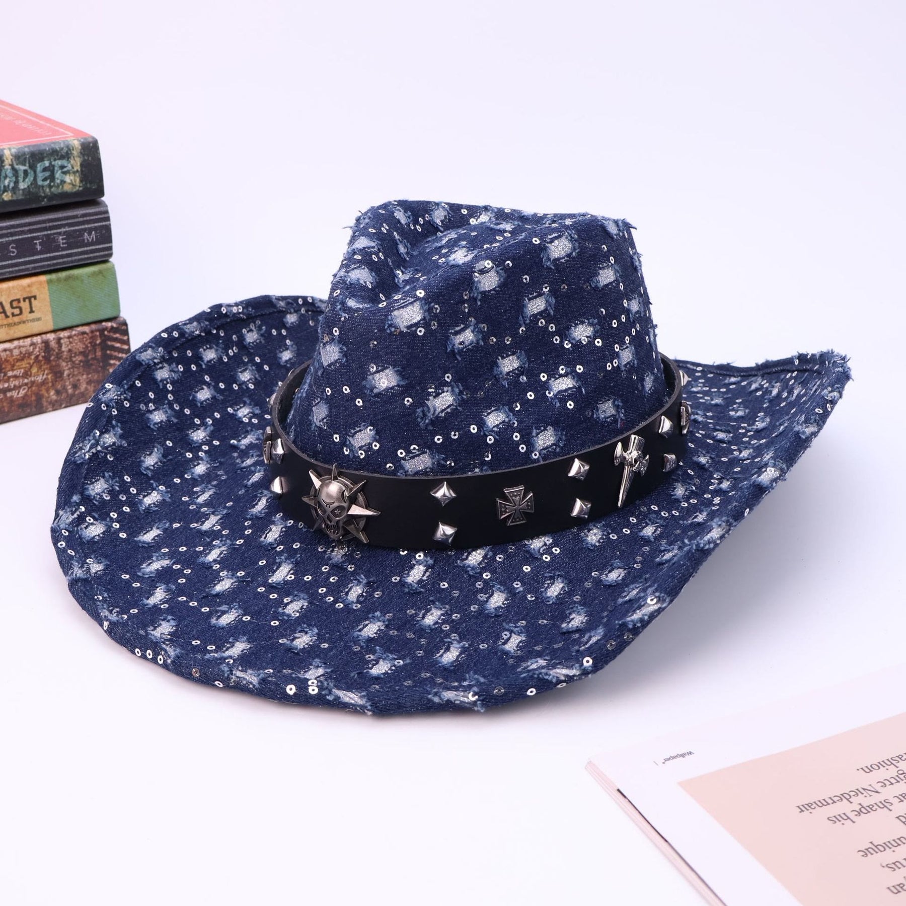 Men's Silver Skull Black Belt Ripped Cowboy Hat