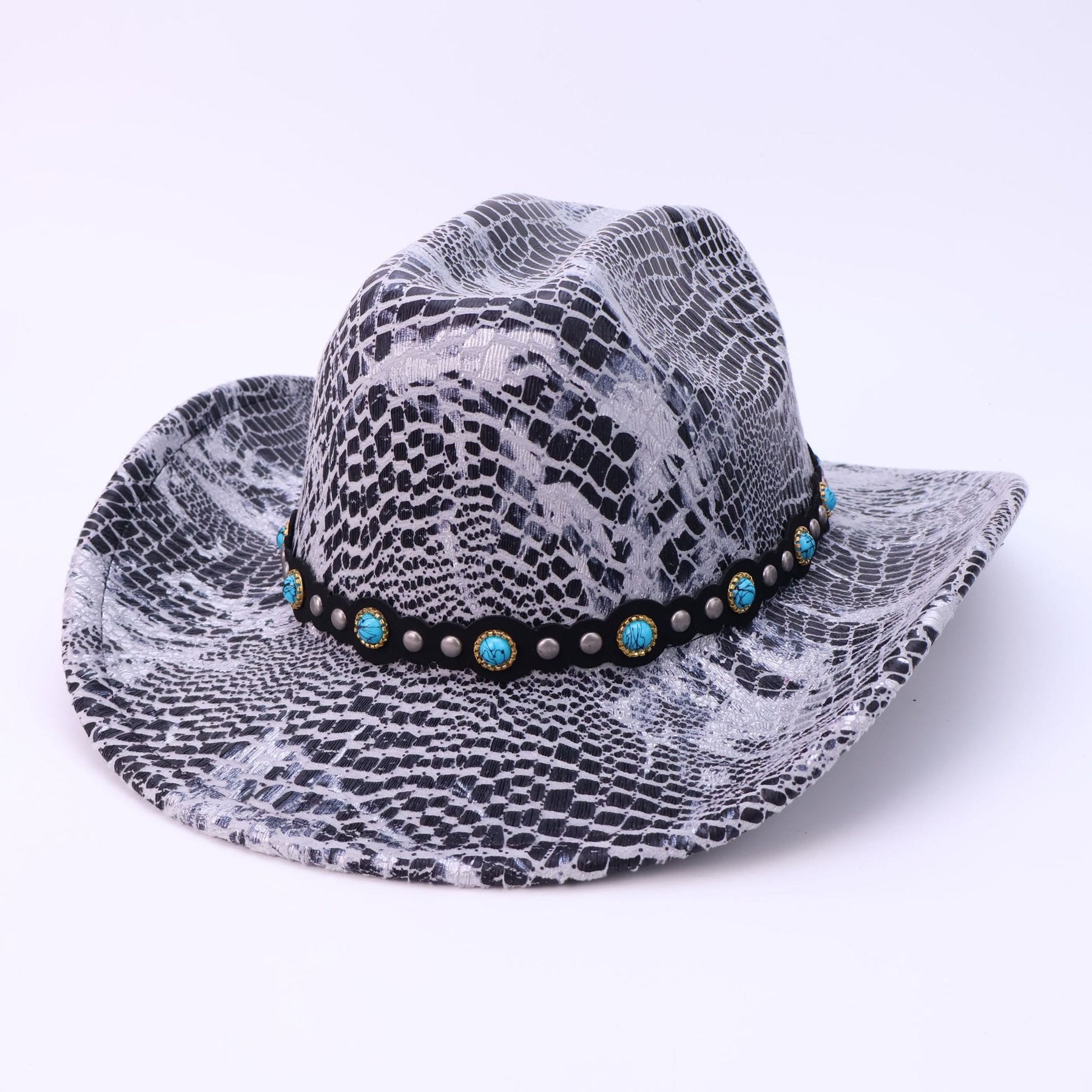 - This hat features crocodile pattern as the base, paired with turquoise black trim, blending Western retro and wild trendy elements.