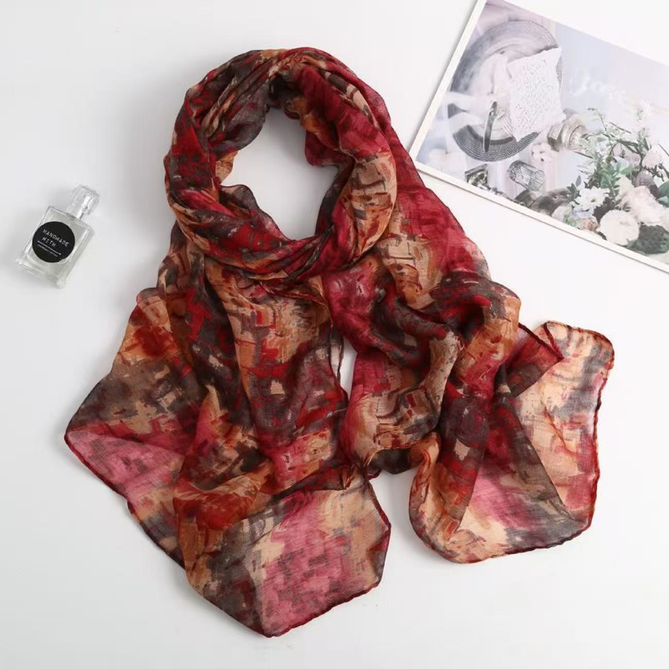 This is an oil painting dyed scarf full of artistic atmosphere, made of lightweight and breathable fabric, with rich colors and a hazy and soft texture. The lightweight material has excellent drape;