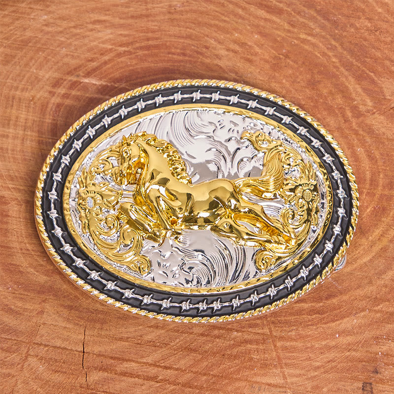 This is a three color metal belt buckle with a Western retro style: made of gold, silver, and black electroplated metal, with an oval shaped outer ring decorated with wire mesh elements.