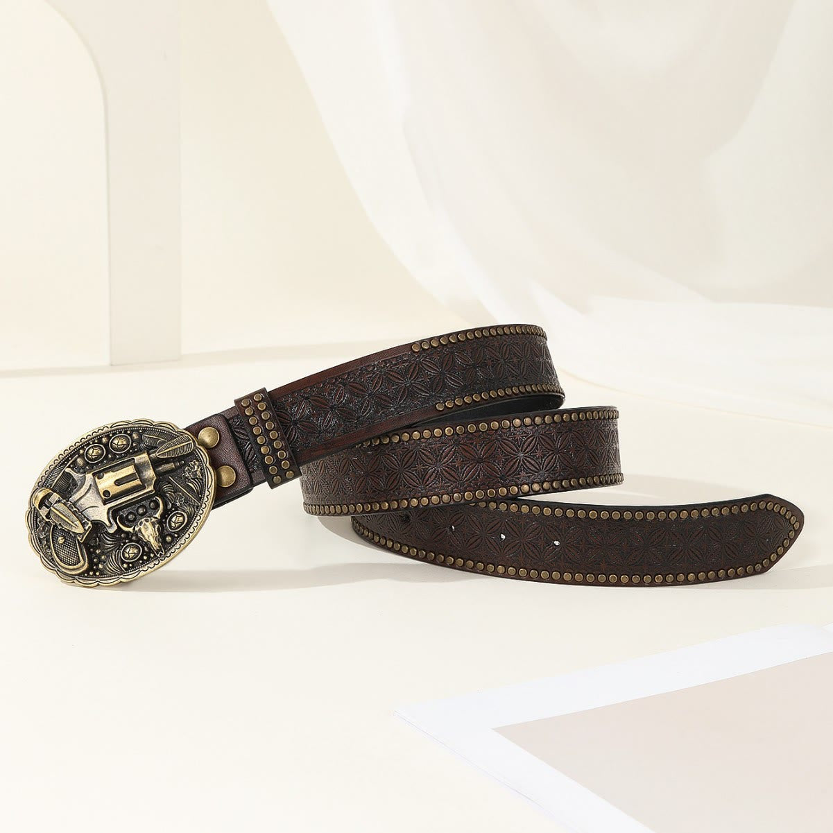 Men's Retro Carved Gun And Bull Skull Emblem Leather Belt