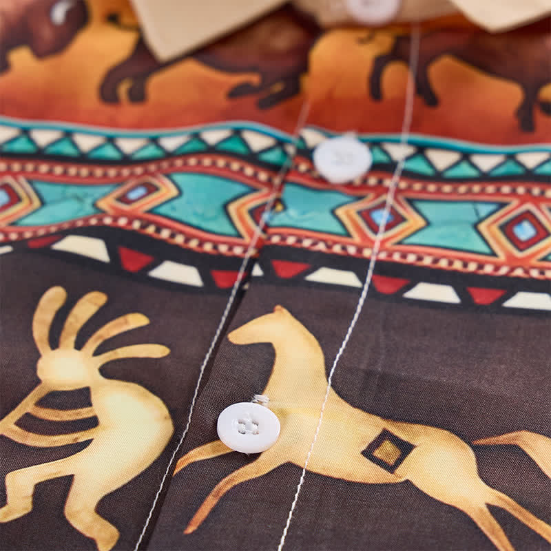 Elevate your western wardrobe with this striking western shirt, a bold fusion of traditional indigenous artistry and modern casual style. The warm, earthy color palette of tan, deep brown, and vibrant accent hues perfectly complements the rugged, timeless western aesthetic, making it ideal for everyday wear, rodeo events, ranch days, or casual outings.
