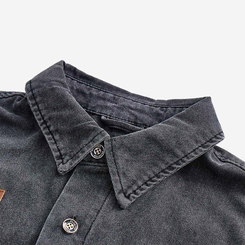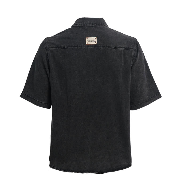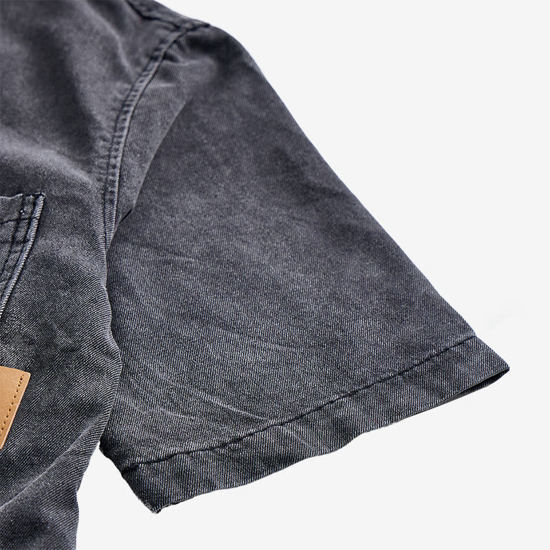 - Elevate your casual wardrobe with our Men's Contrast Pocket Short Sleeve Denim Shirt, designed for a rugged workwear-inspired aesthetic.