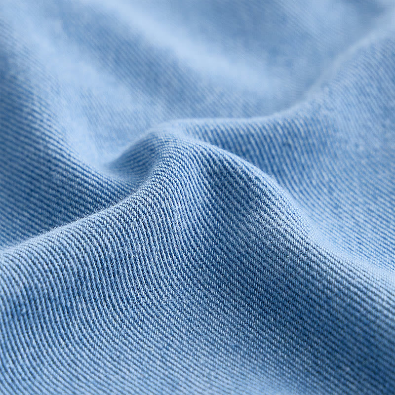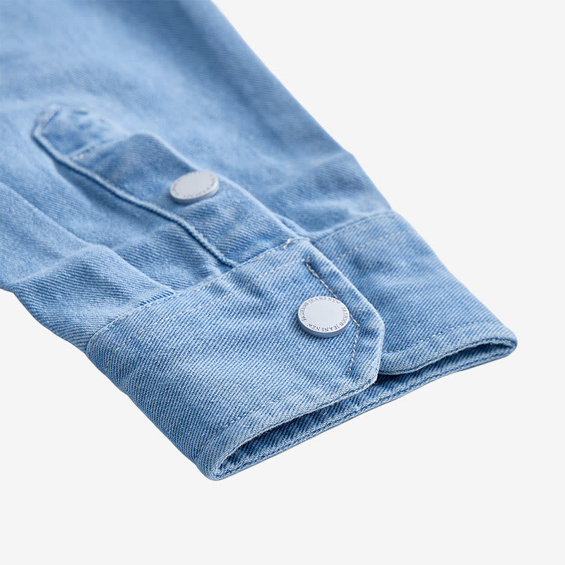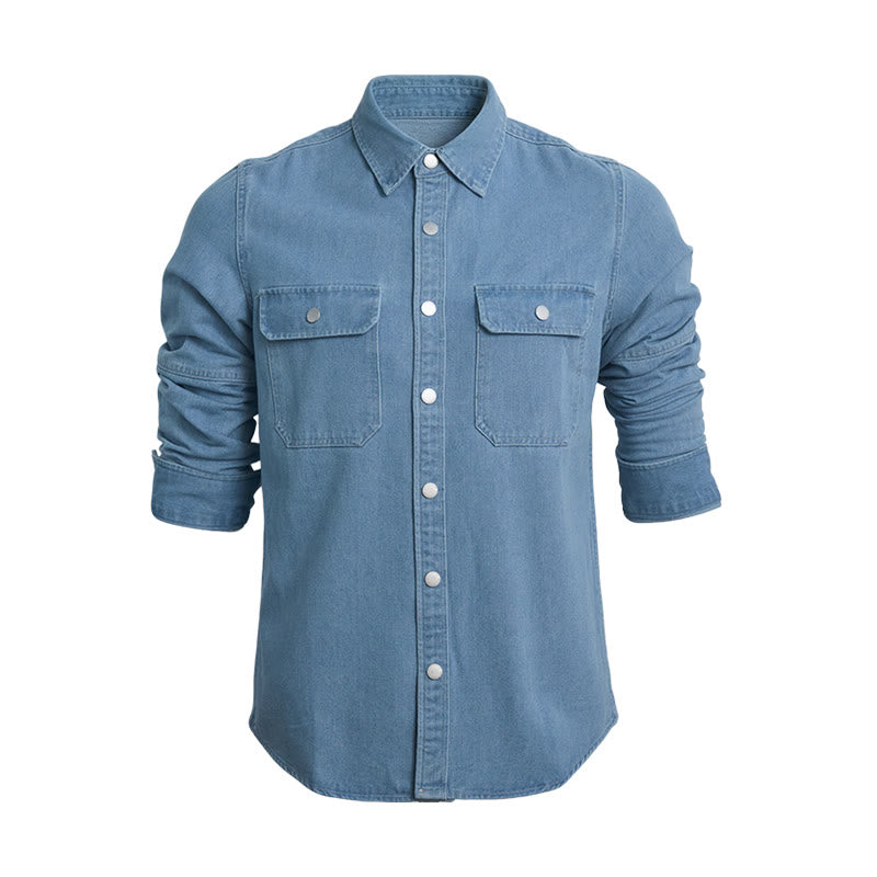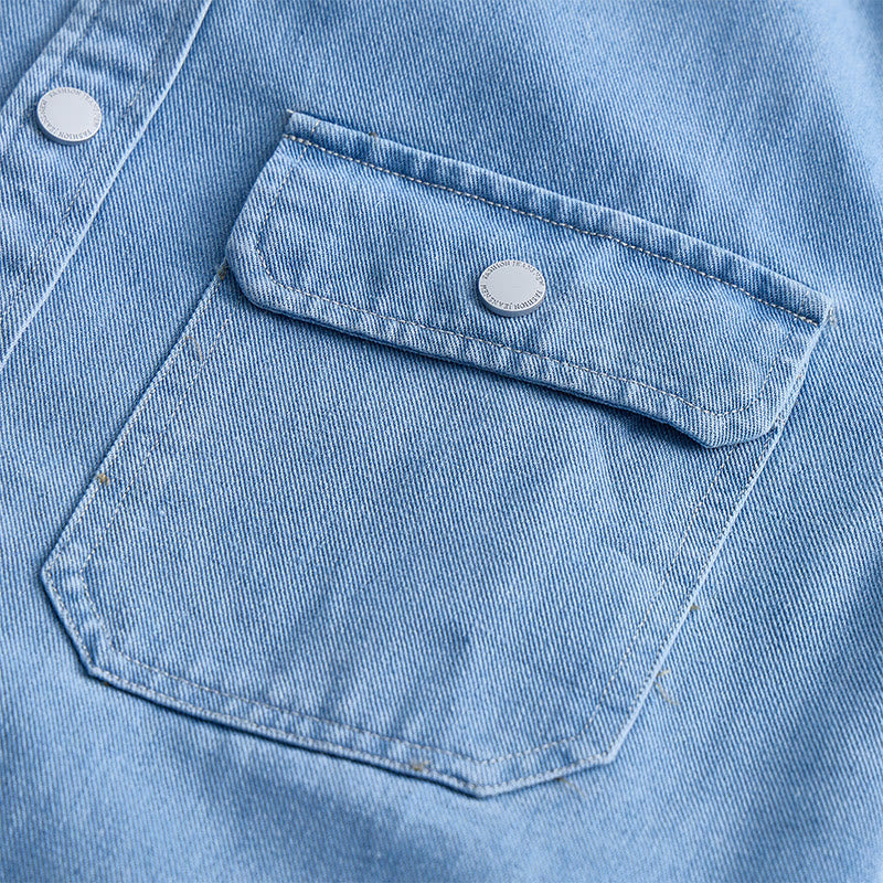 - Crafted with premium denim fabric, it features functional chest pockets and a classic button-front closure for a structured, stylish look.