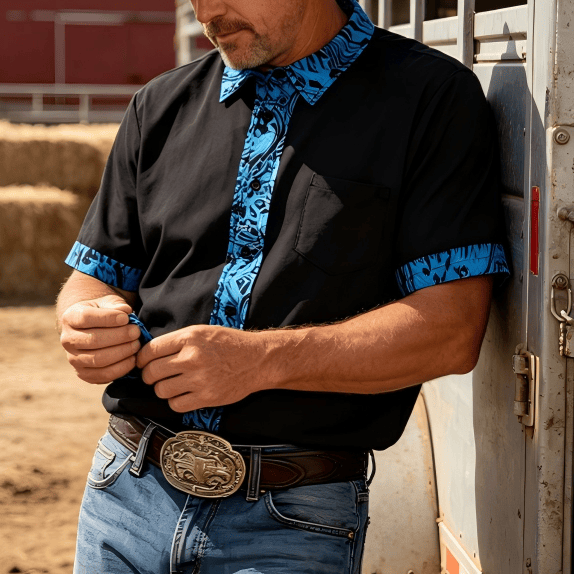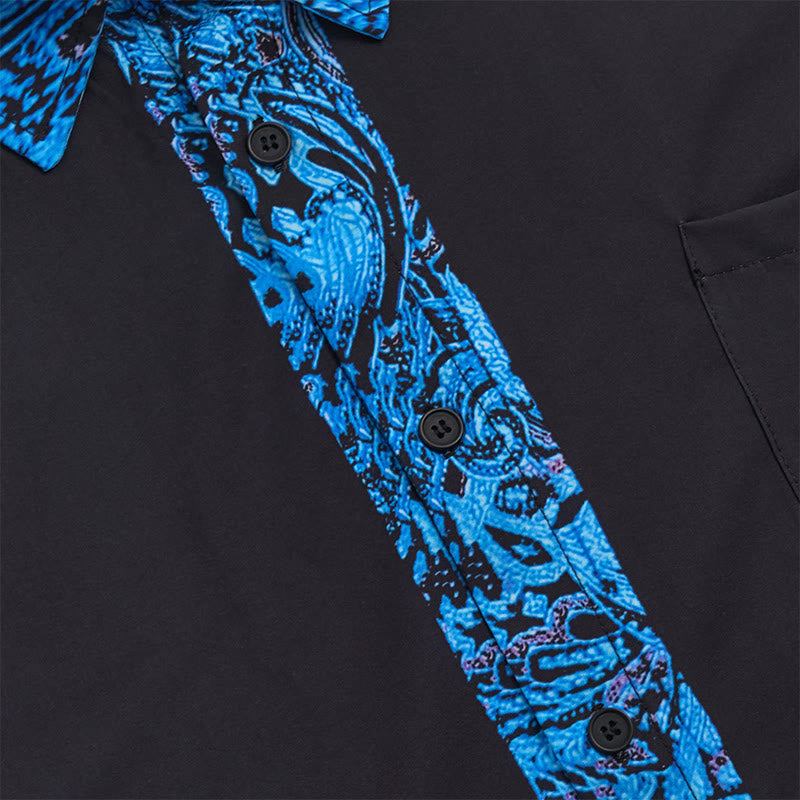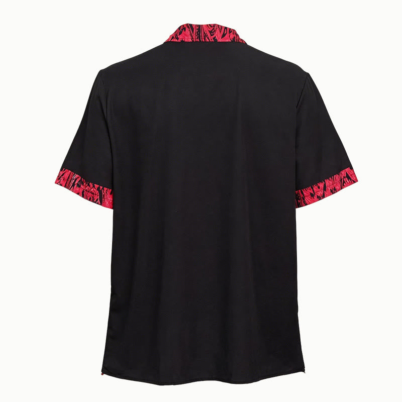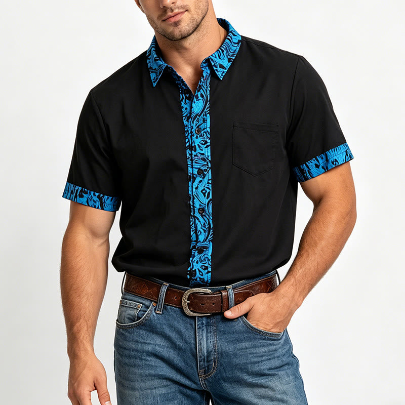 This men's short-sleeve shirt features intricate decorative detailing along the collar, placket and cuffs, elevating the classic solid style with a sophisticated, eye-catching finish.